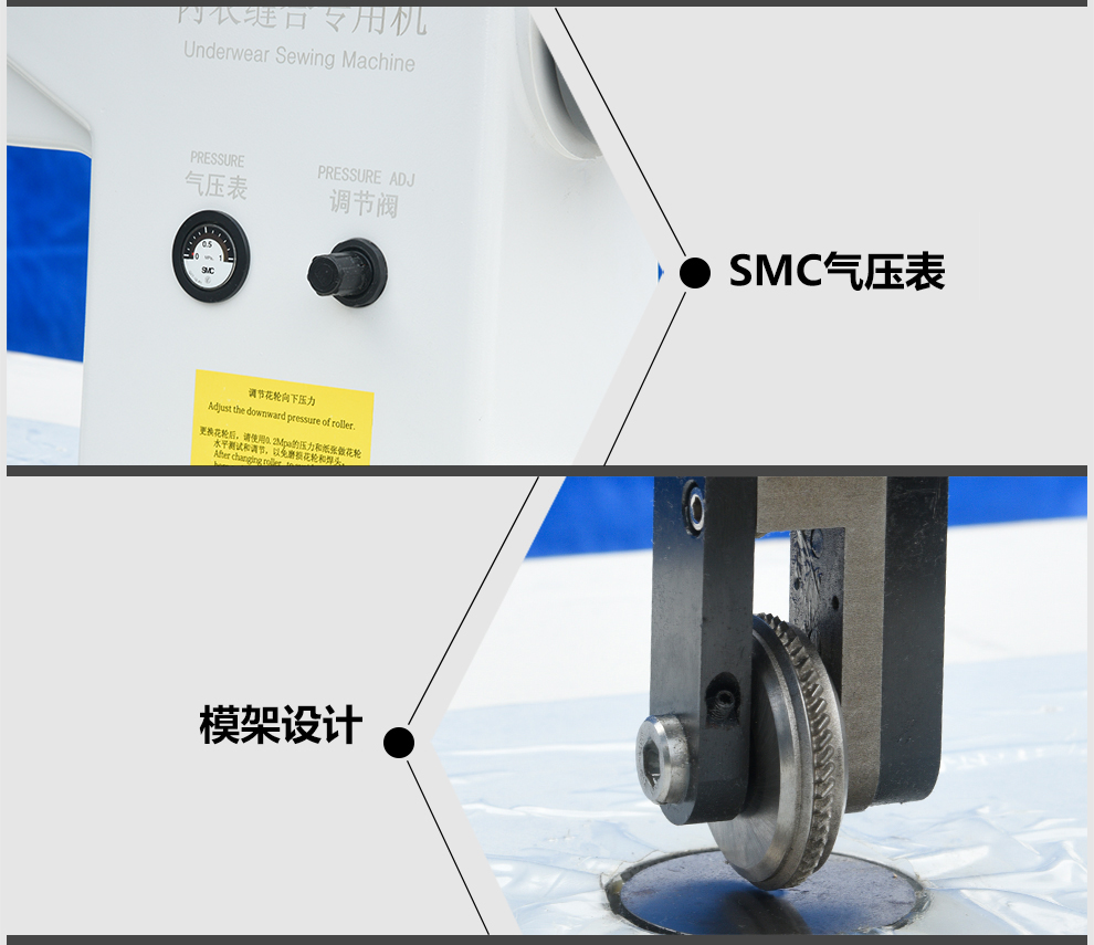 本機(jī)采用超聲波系統(tǒng),操作方便,工作效率高,為目前流行的無縫內(nèi)衣(文胸、內(nèi)褲等)而設(shè)計(jì)的設(shè)備,切邊柔軟無散邊,縫合強(qiáng)度高,外形美觀。