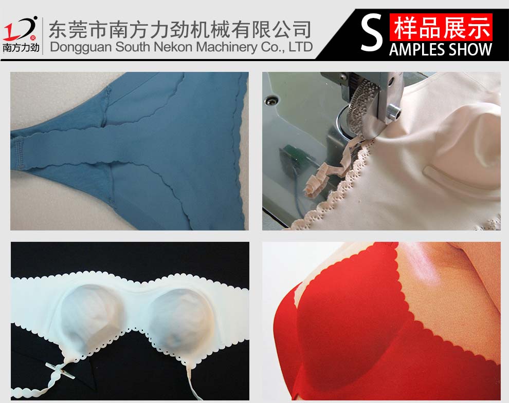 超聲波內(nèi)衣機(jī)是將超聲波運(yùn)用在內(nèi)衣產(chǎn)品上,通過超聲波花輪對(duì)內(nèi)衣的周邊進(jìn)行切邊,壓各式暗紋或壓各式花孔,并能對(duì)邊緣或不同規(guī)則花形孔狀進(jìn)行熔邊處理,熔切邊柔軟、不脫絲,不破口,不損壞材料,不散邊,不損壞內(nèi)衣材料原有的特性,花邊形狀隨意可變,使其周邊平滑具有彈性可準(zhǔn)確表達(dá)女性的內(nèi)在感受與外在氣質(zhì).