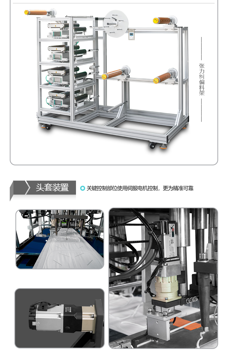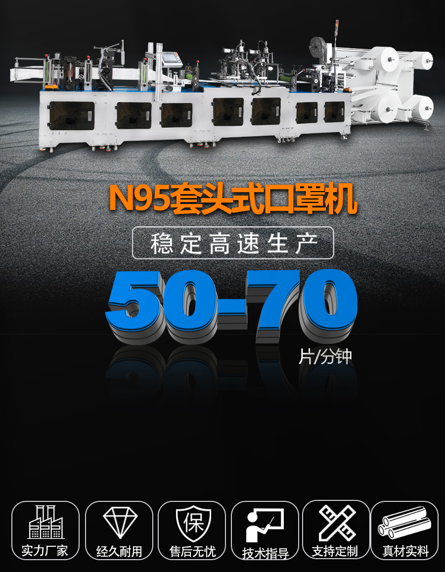 南方力勁頭套式KN95口罩機采用一體化機型設計,實現全自動化生產,每分鐘產能40-70個,是生產外科用KN95口罩的必選設備。